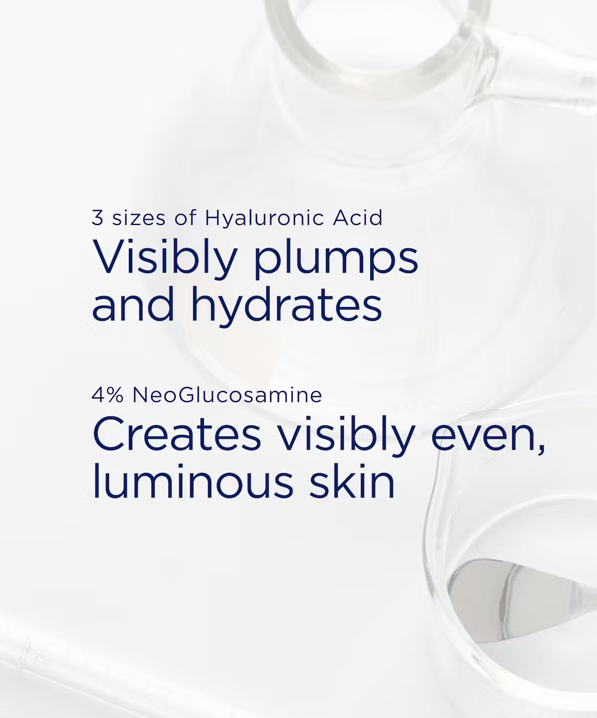 - Intense hydration. Total illumination. This luxurious, lightweight gel-cream delivers three different sizes of Hyaluronic Acid that penetrate into skin’s surface to provide plumping hydration, smoothing the look of wrinkles. NeoGlucosamine delivers gentle exfoliation reducing the look of age spots, promoting visible firming and leaving skin looking more luminous.