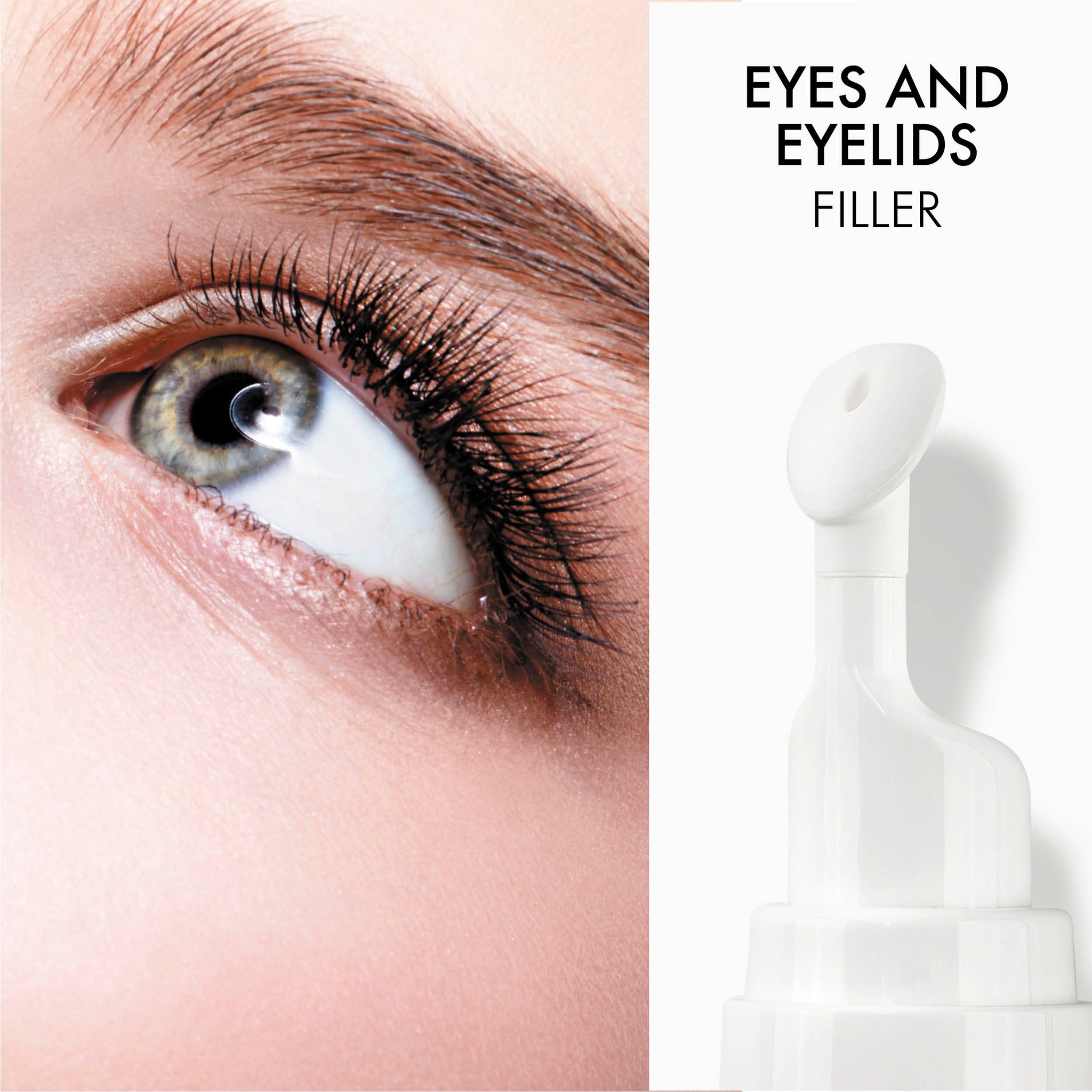 This densifying filler preparation for Eyes and Eyelids is a dermo-cosmetic gel treatment that promotes the filling of the crow’s feet wrinkles on the eye contour and helps lift the eyelids. It contains a highly modulated concentration of 12 molecules od Hyaluronic Acid, completed by 3 Collagen and 2 Elastin molecules with differentiated molecular weights to give firmness and plasticity to the tissues of the eye contour and eyelids. A special ingredient supports the anti-wrinkle effect on the eye contour and on the eyelids, by promoting the reduction of the skin micro-contractions, which enhance the appearance of expression lines.