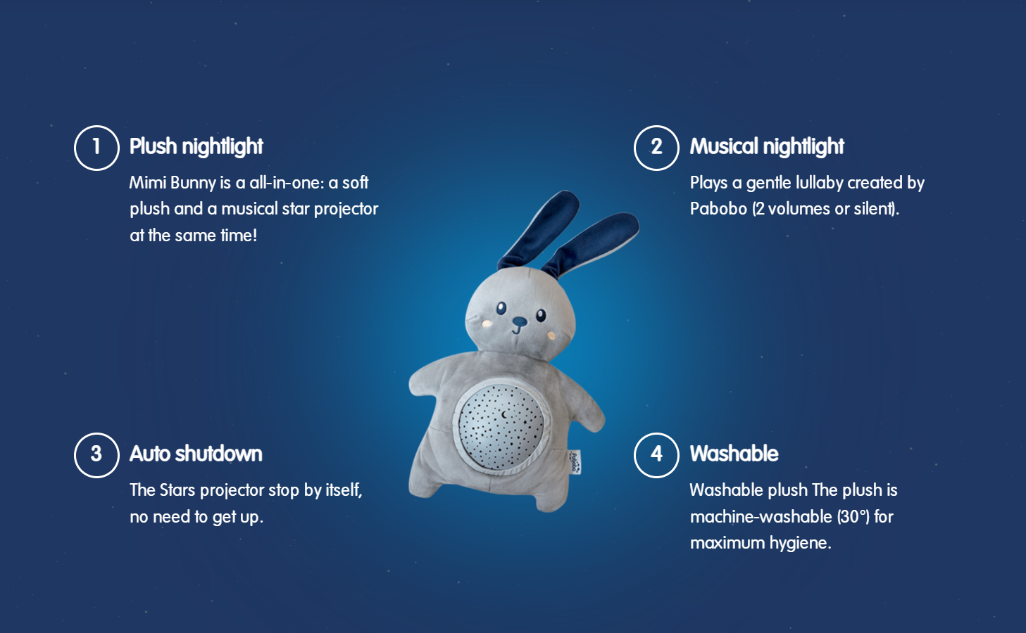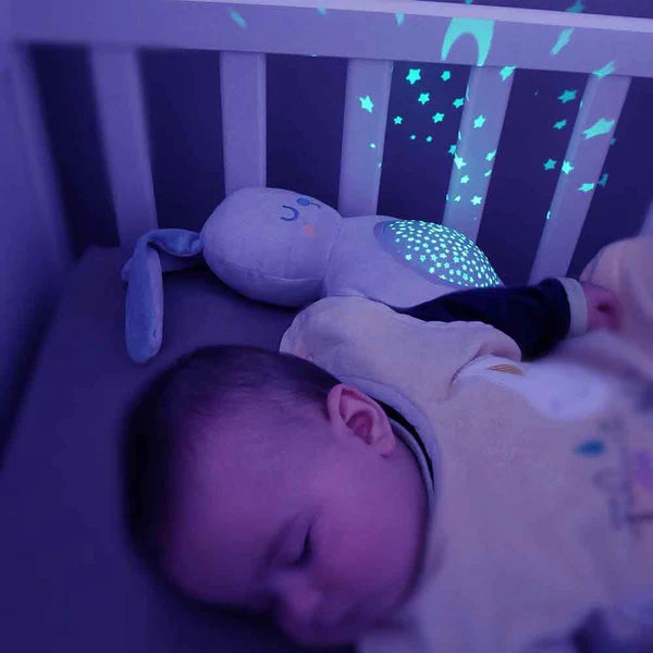 Mimi Bunny projects a pretty starry sky on the ceiling to help toddlers fall asleep. The stars slowly change color and you can stop at their favorite color.