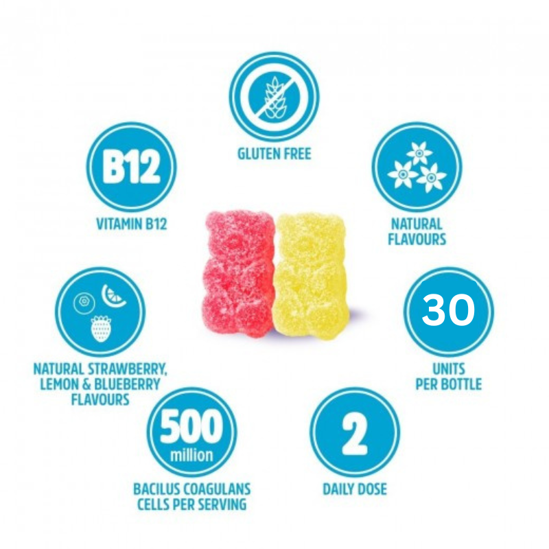 Gluten-free and with natural flavourings, each serving of Vitaldin Probiotic Gummies provides 500 million CFU of Bacillus Coagulans and Vitamin B12 that will contribute to the health of our intestinal tract.