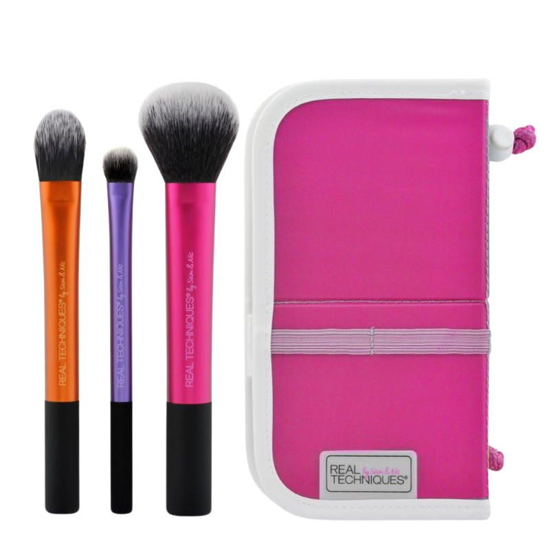 Real Techniques Travel Essentials Set, featuring three full-size brushes (RT 200, RT 400, RT 300) and a portable, upright pink brush case for on-the-go makeup application.