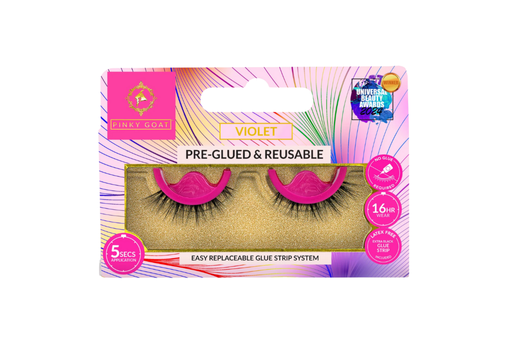 - Pinky Goat Violet Pre-Glued Lashes – Lightweight, reusable lashes featuring pre-applied adhesive for quick, effortless glam—no glue, no mess, just instant volume and lift.