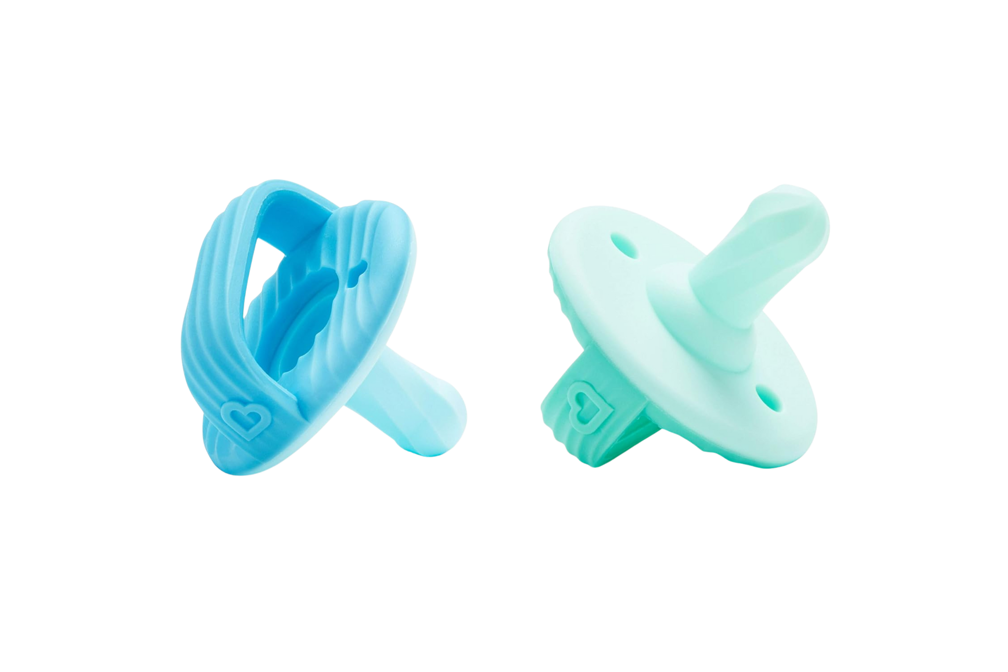 - Munchkin Sili-Soothe & Teethe ™ Silicone Pacifier & Teether – 2-in-1 silicone soother that soothes sore gums and works as a pacifier. BPA-free and lightweight.